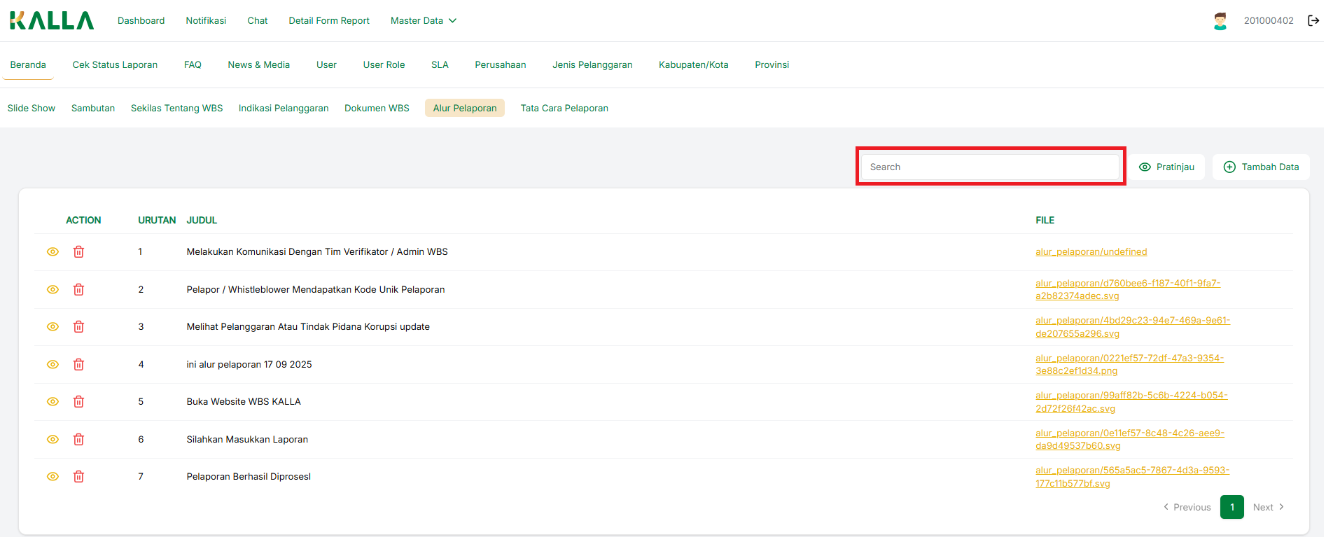 2. Untuk mencari data pada menu Alur Pelaporan, tulis keyword Kolom search App Screenshot