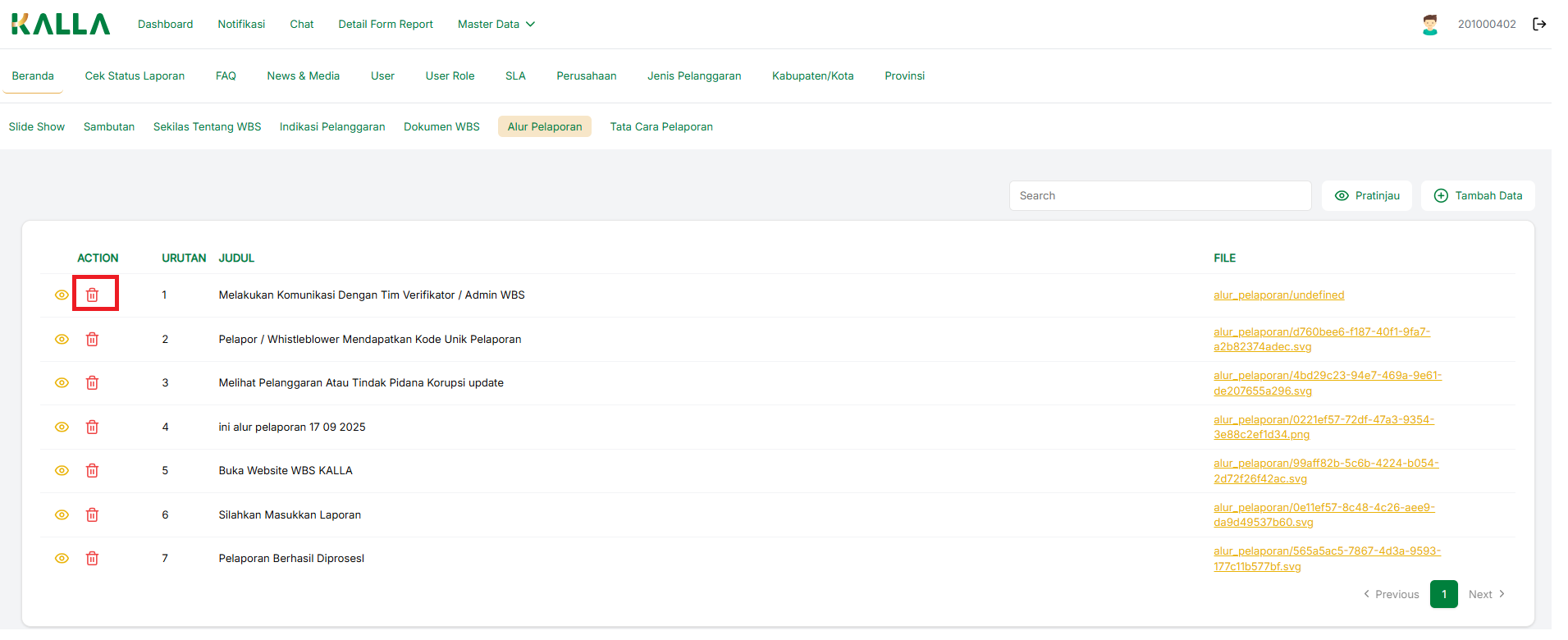 7. Untuk menghapus isi pada Alur Pelaporan, tekan ikon App Screenshot