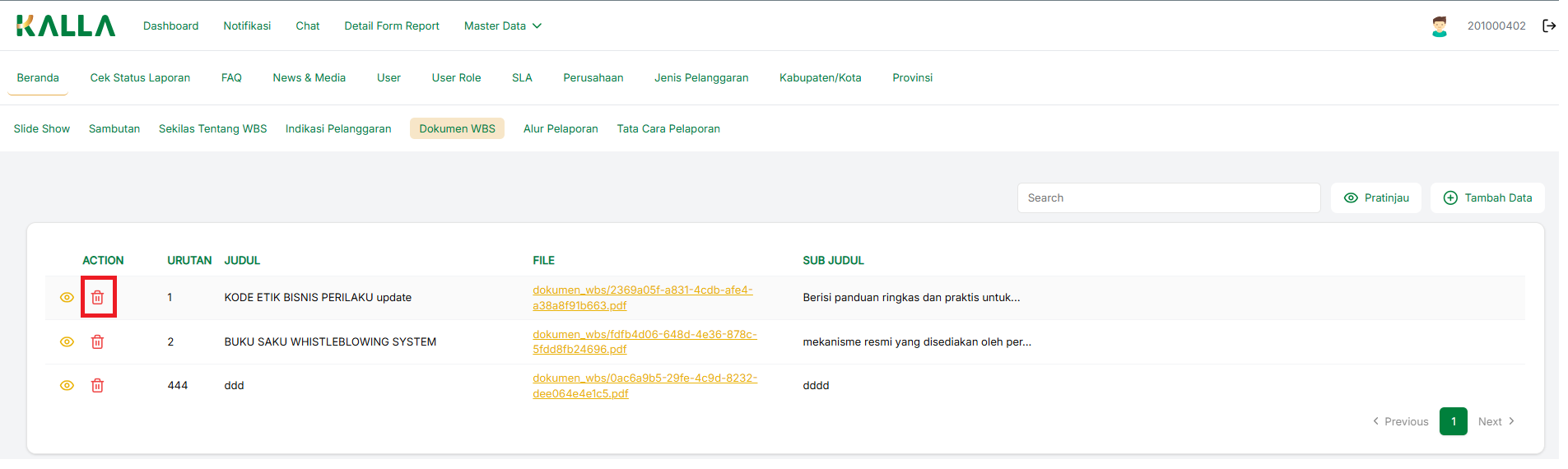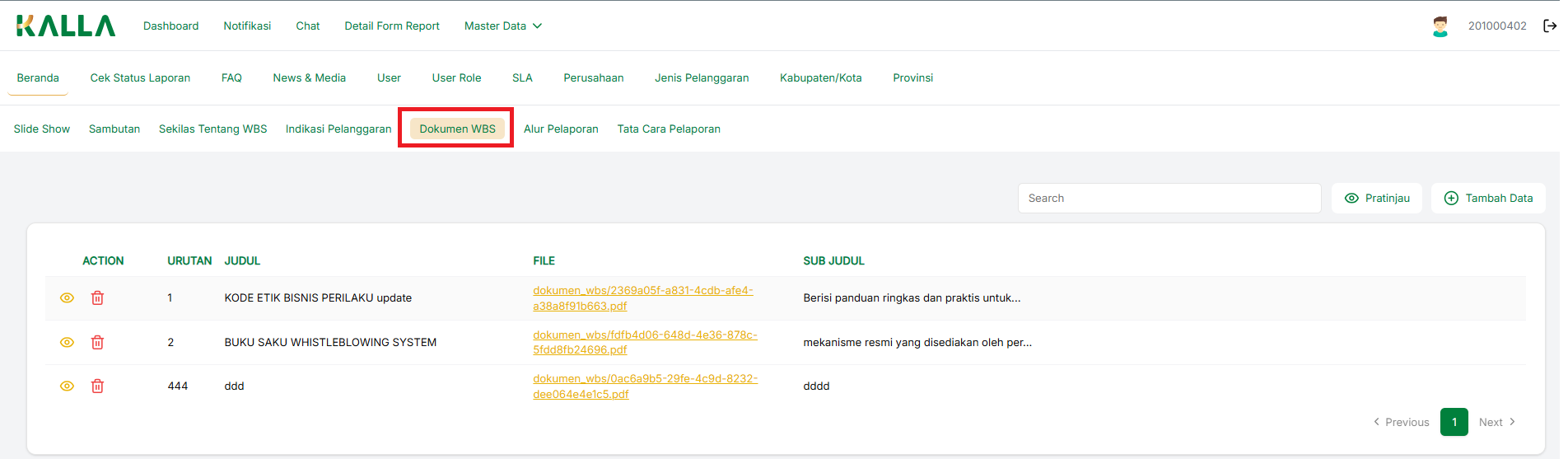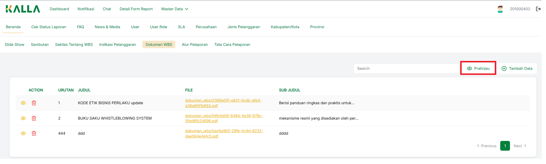 Untuk melakukan pratinjau pada menu Dokumen WBS, tekan Pratinjau