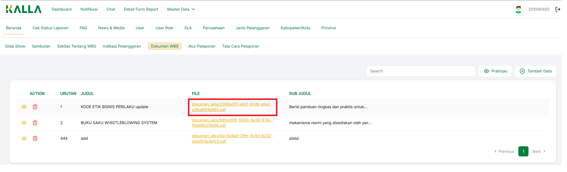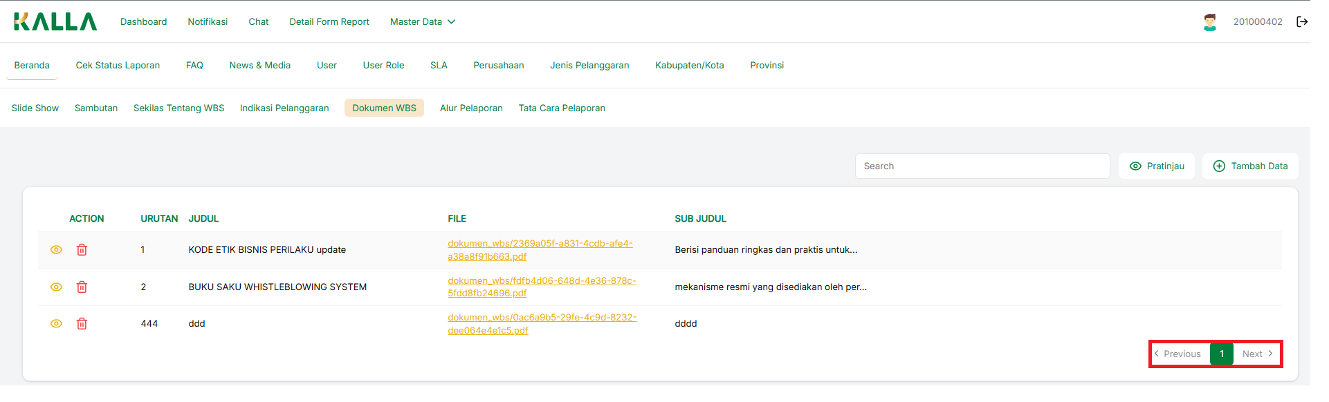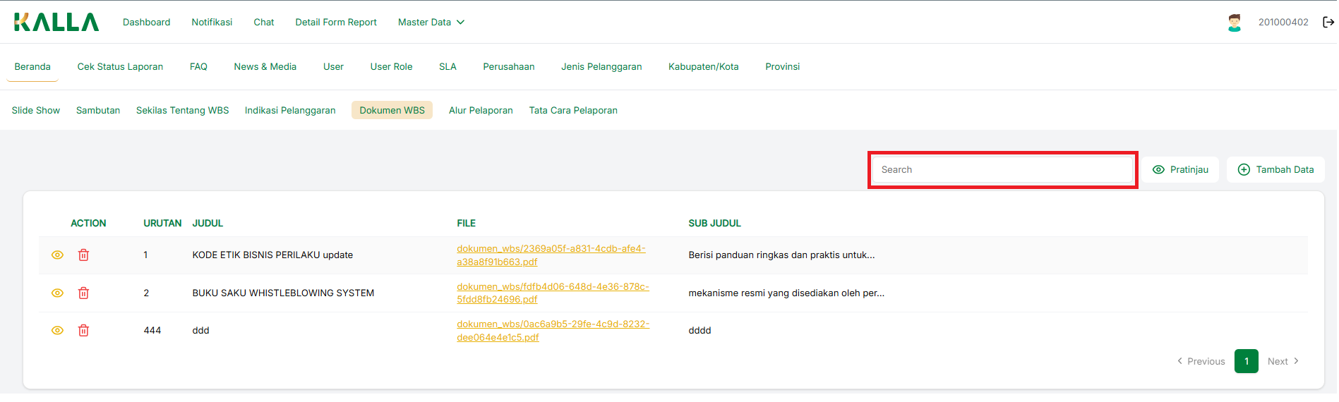 Untuk mencari data pada menu Dokumen WBS, tulis keyword Kolom search