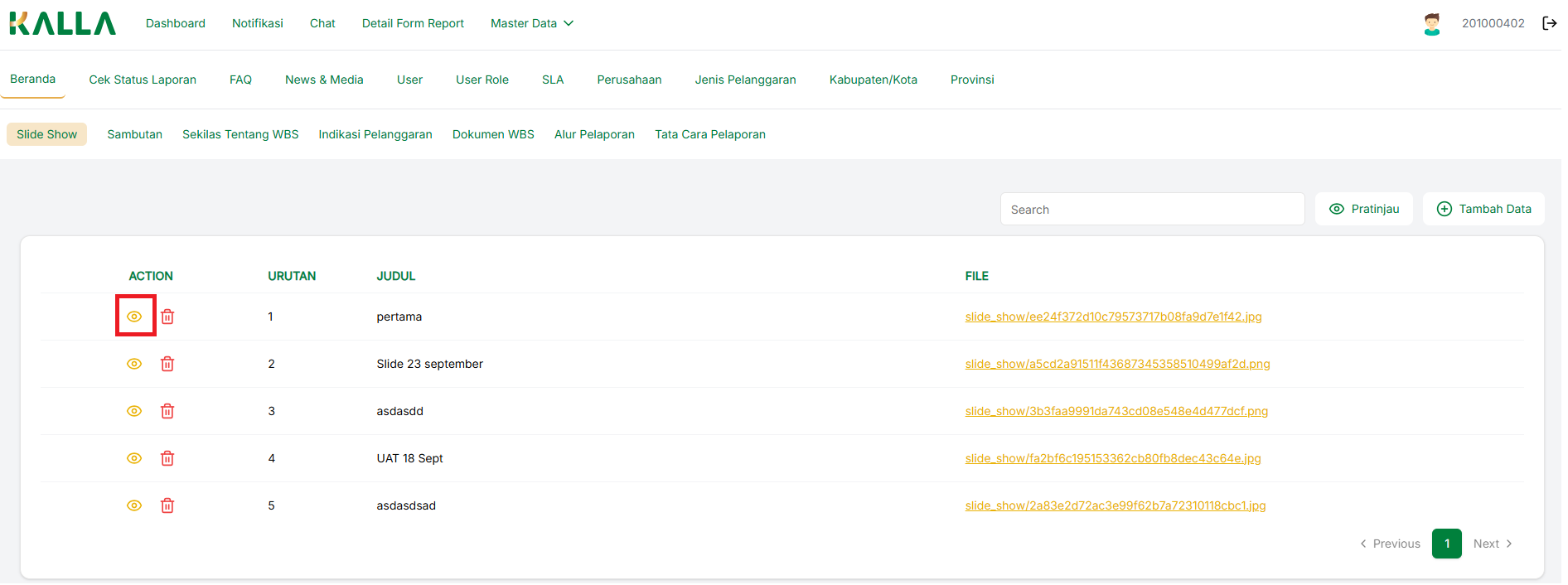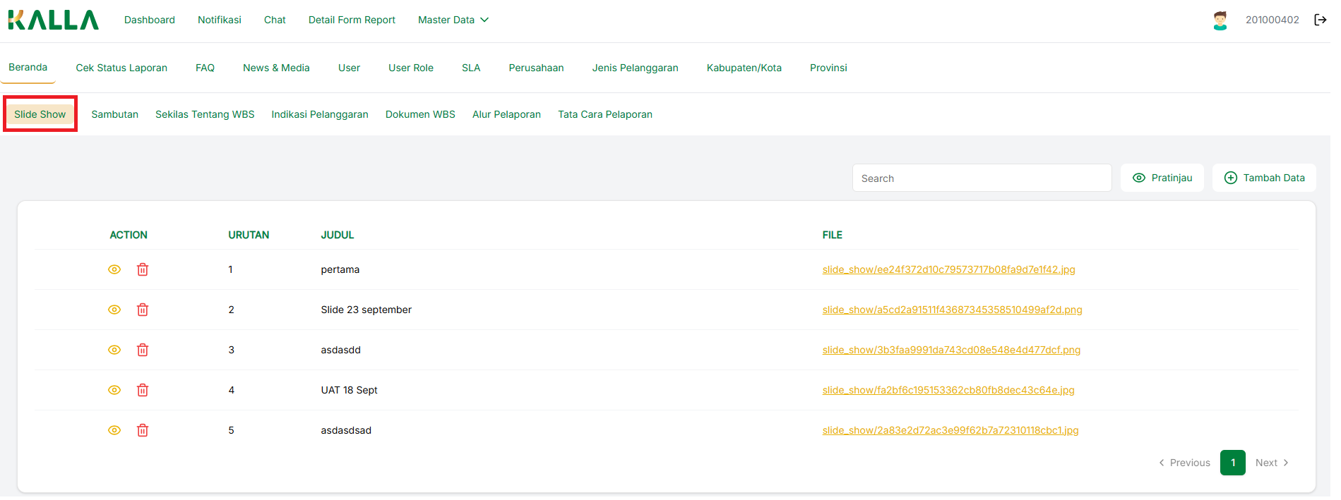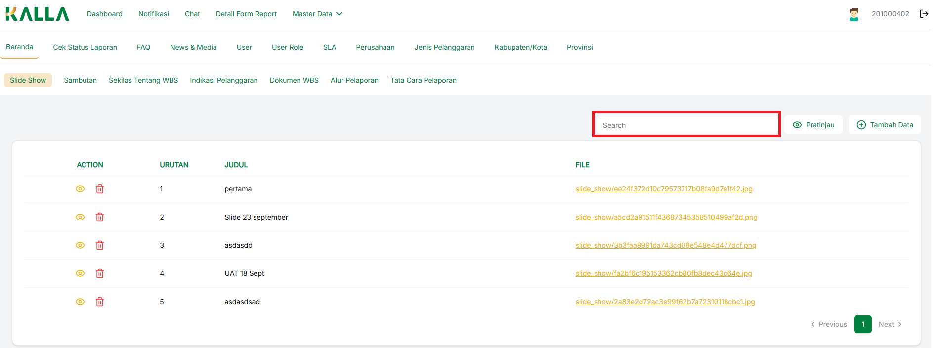 Untuk mencari data pada menu Slide Show, tulis keyword Kolom search