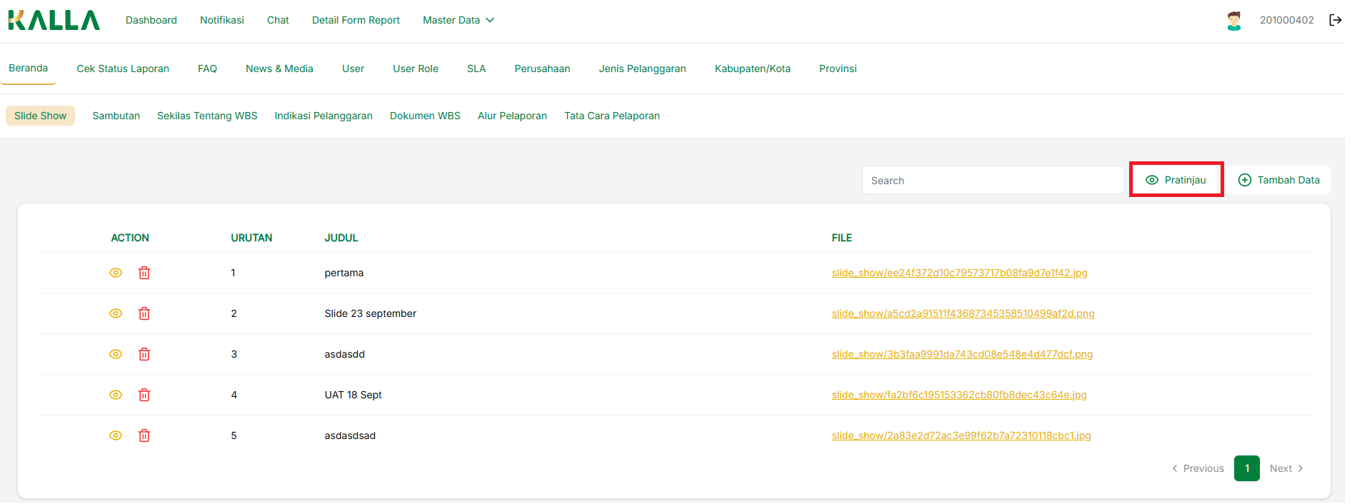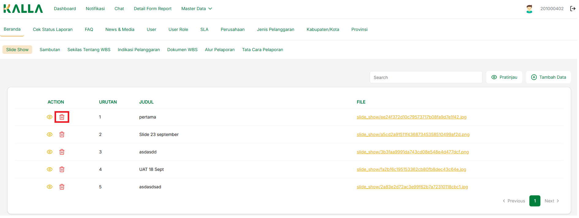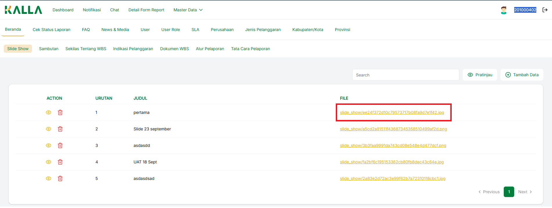Untuk mencari data pada menu Slide Show, tulis keyword Kolom search