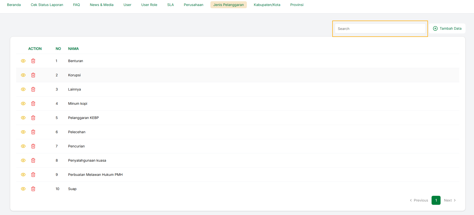 Untuk melakukan mencarian, cukup ketikkan kata kunci yang ingin dicari pada filed pencarian, maka daftar data Jenis Pelanggaran akan terfilter sesuai kata kunci yang dimasukkan