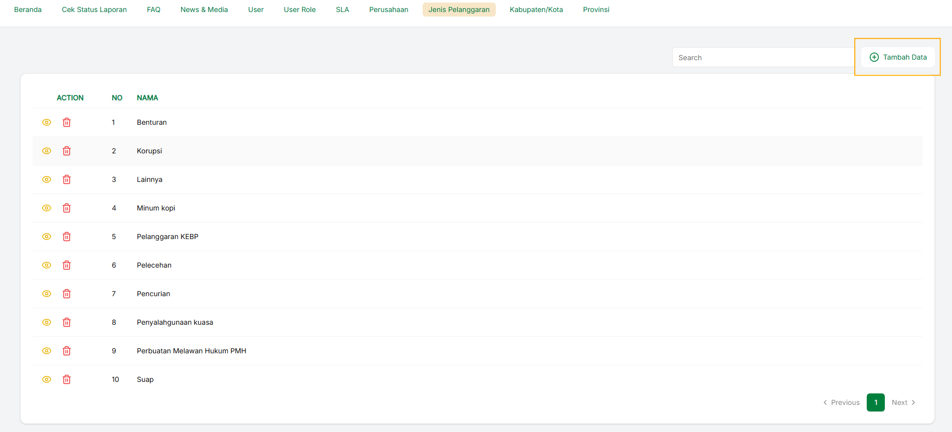 Menu Jenis Pelanggaran, memiliki beberapa fitur, diantranya: