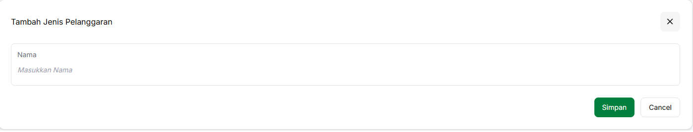 setelah menekan tombol tambah data, form untuk membuat data Jenis Pelanggaran, akan terbuka, di sini kita bisa mengisi data Jenis Pelanggaran yang ingin kita buat