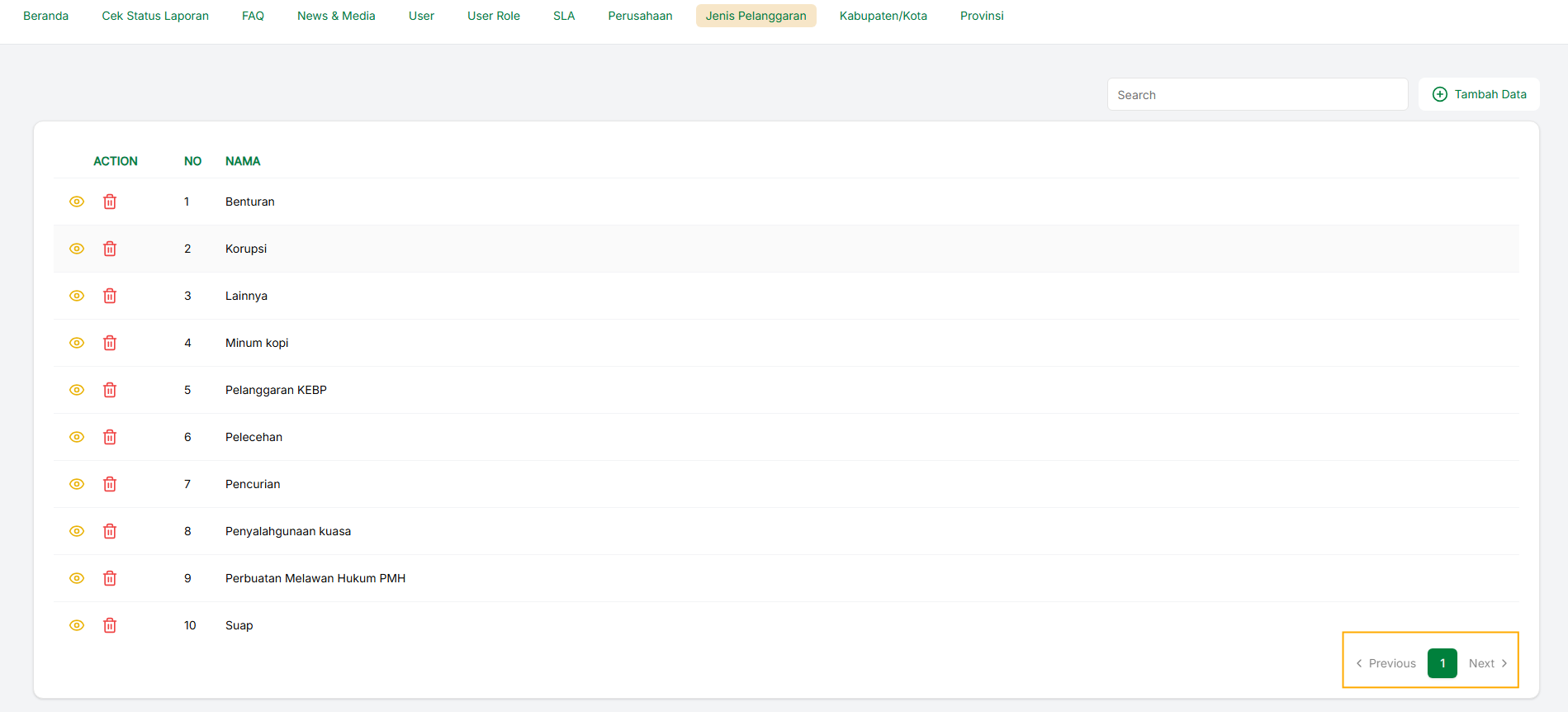 Jika data Jenis Pelanggaran yang kita buat sudah banyak, maka sistem akan membagi daftar data menjadi beberapa halaman, ketika kita membuka menu Jenis Pelanggaran, maka kita akan berada pada halaman 1, jika ingin mengganti ke laman lain, kita bisa menekan tombol dengan angka langsung, yang akan membawa kita ke halaman tersebut, atau menekan tombol: