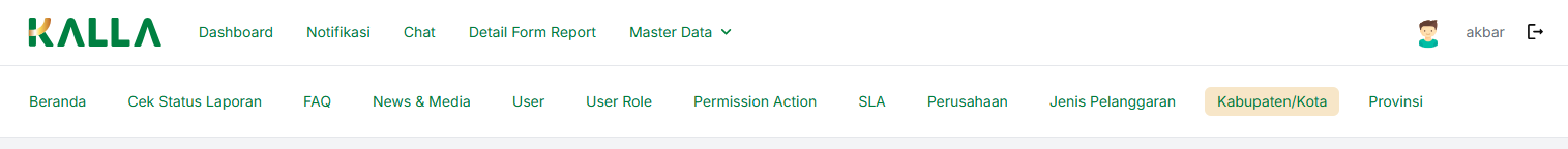 data Kabupaten/Kota pada form pembuatan laporan, bisa disesuaikan melalui menu Kabupaten/Kota pada modul master data