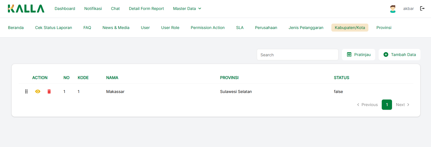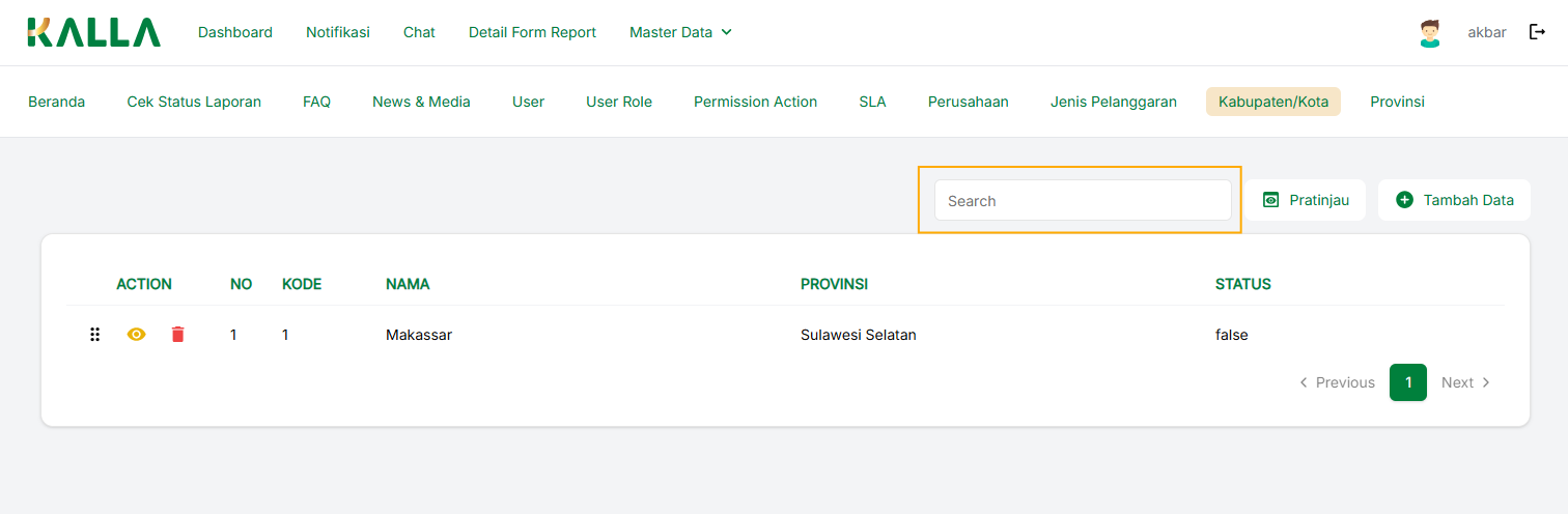Pada menu Kabupaten/Kota, kita diberikan fitur pencarian data, untuk melakukan pencarian data Kabupaten/Kota berdasarkan nama