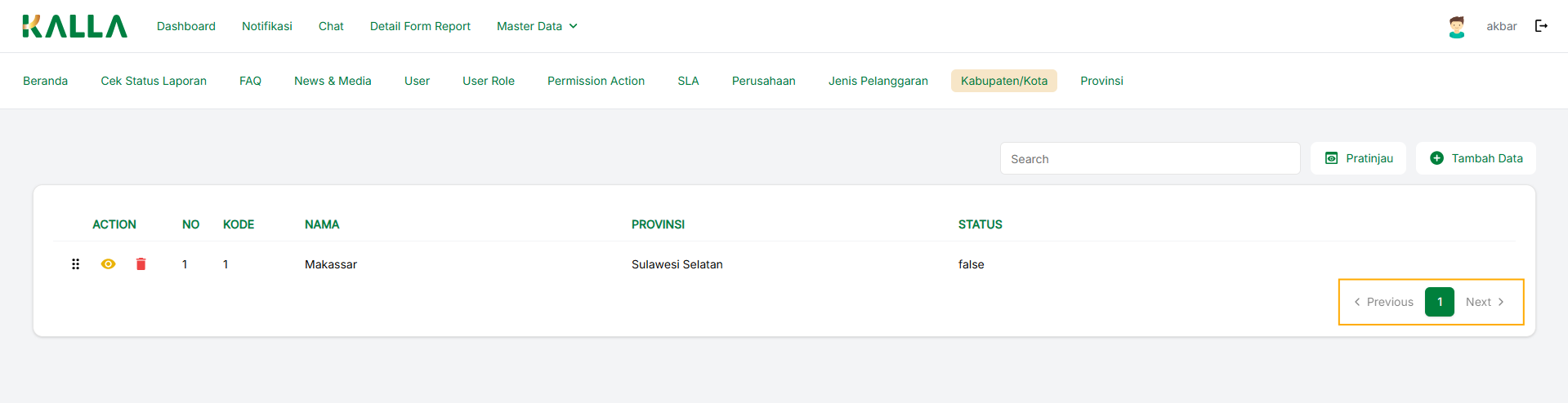Jika data Kabupaten/Kota yang kita buat sudah banyak, maka sistem akan membagi daftar data menjadi beberapa halaman, ketika kita membuka menu Kabupaten/Kota, maka kita akan berada pada halaman 1, jika ingin mengganti ke laman lain, kita bisa menekan tombol dengan angka langsung, yang akan membawa kita ke halaman tersebut, atau menekan tombol: