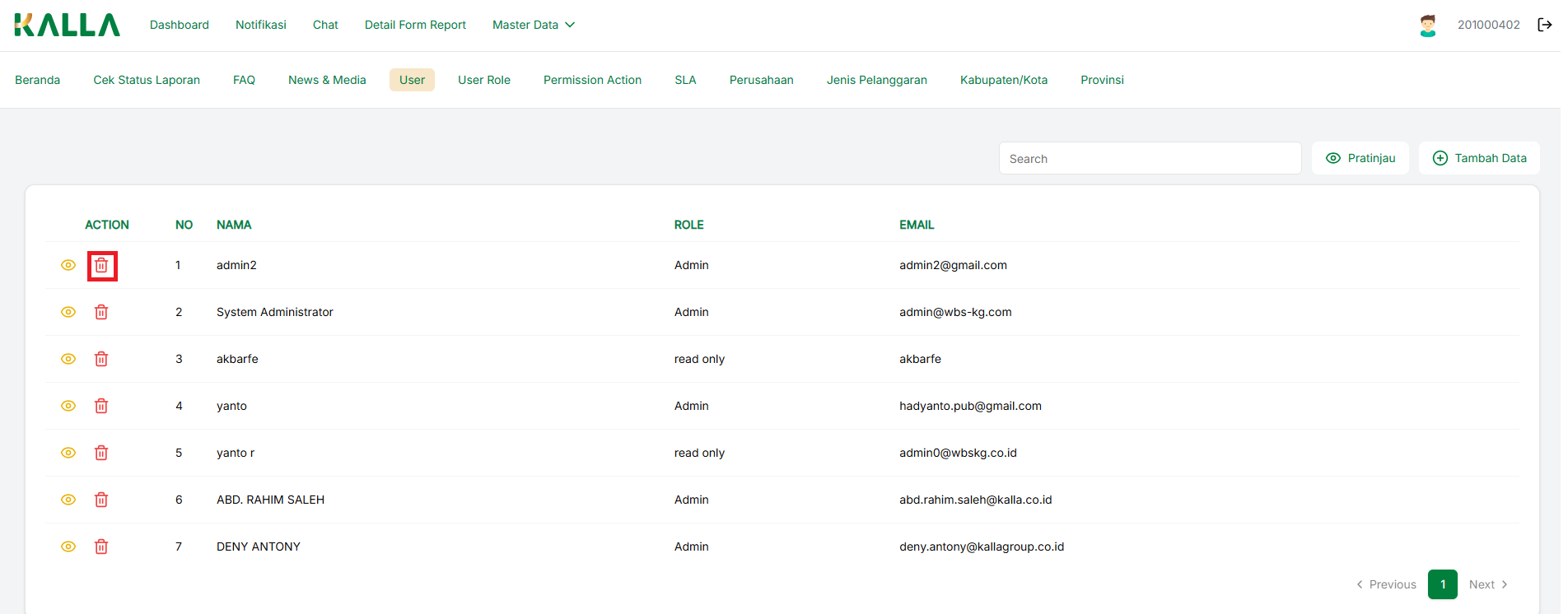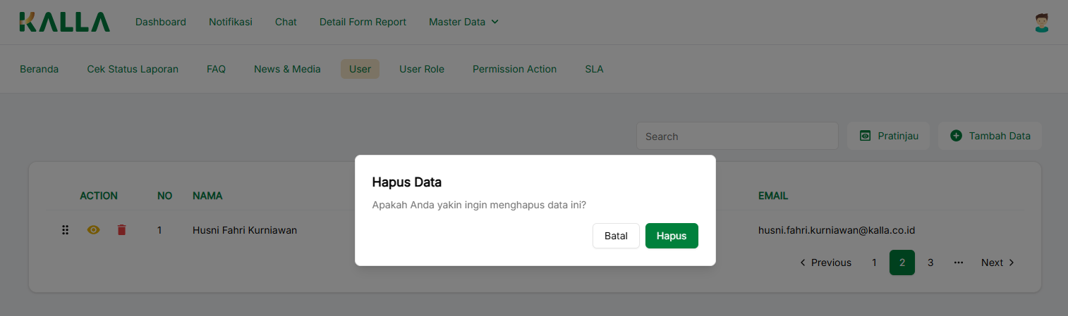 Untuk menghapus data User yang sudah ada, kita bisa menekan tombol dengan icon