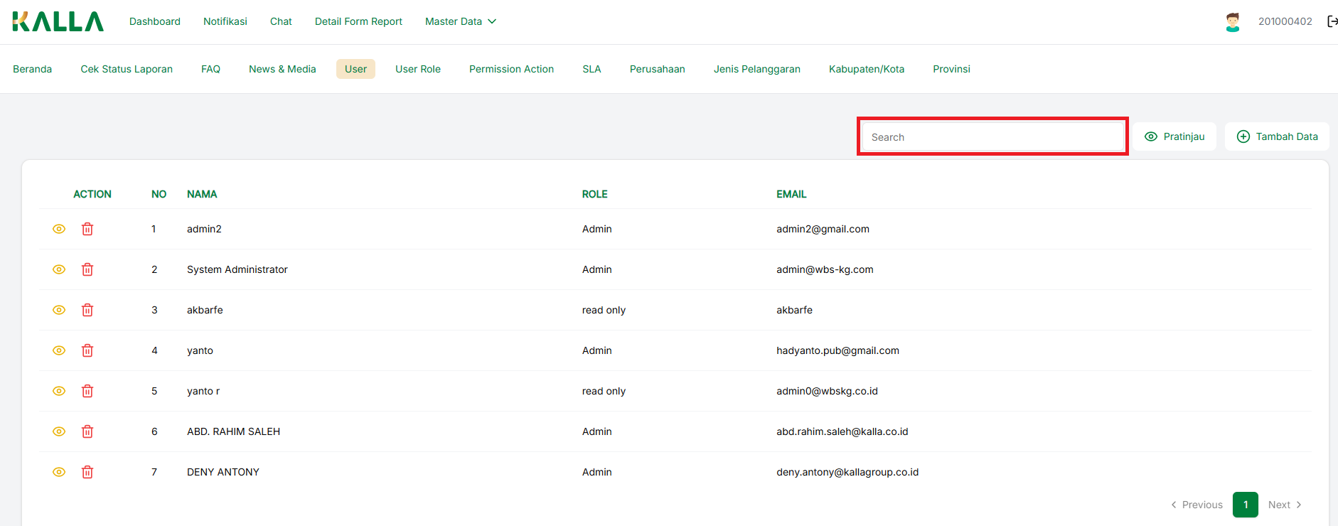 Untuk melakukan mencarian, cukup ketikkan kata kunci yang ingin dicari pada filed pencarian, maka daftar data User akan terfilter sesuai kata kunci yang dimasukkan