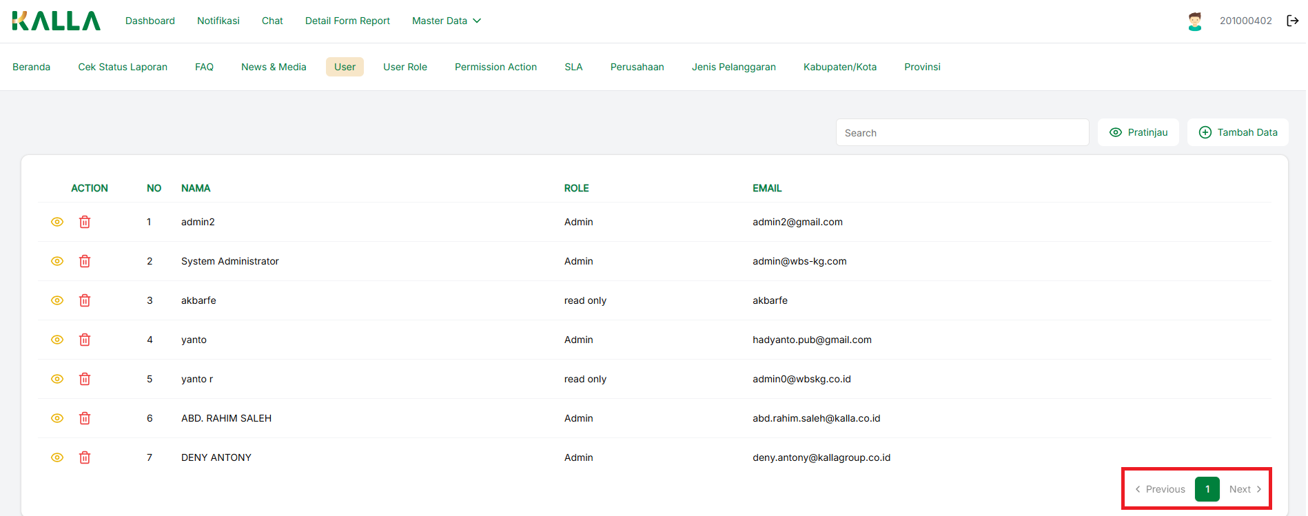 Jika data User yang kita buat sudah banyak, maka sistem akan membagi daftar data menjadi beberapa halaman, ketika kita membuka menu User, maka kita akan berada pada halaman 1, jika ingin mengganti ke laman lain, kita bisa menekan tombol dengan angka langsung, yang akan membawa kita ke halaman tersebut, atau menekan tombol: